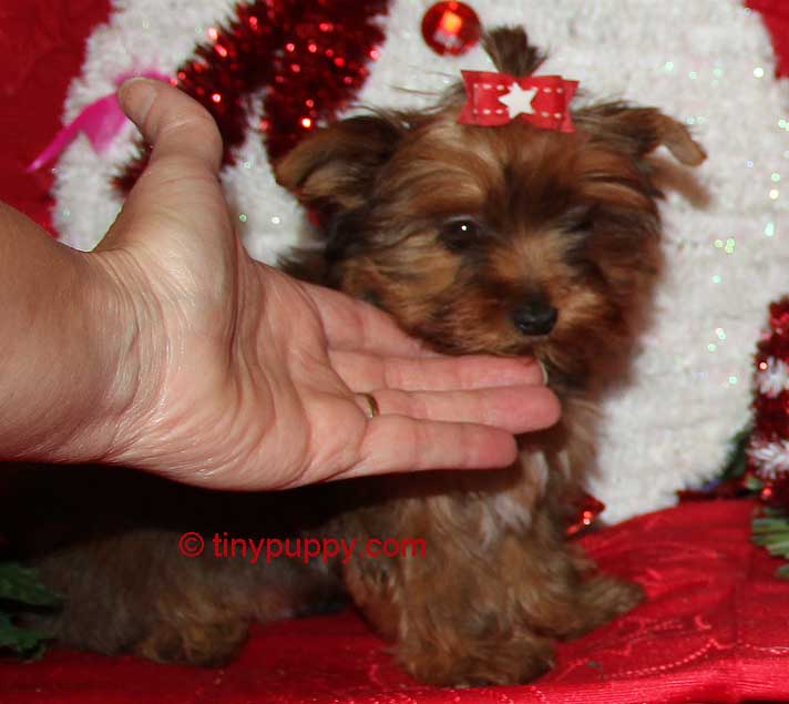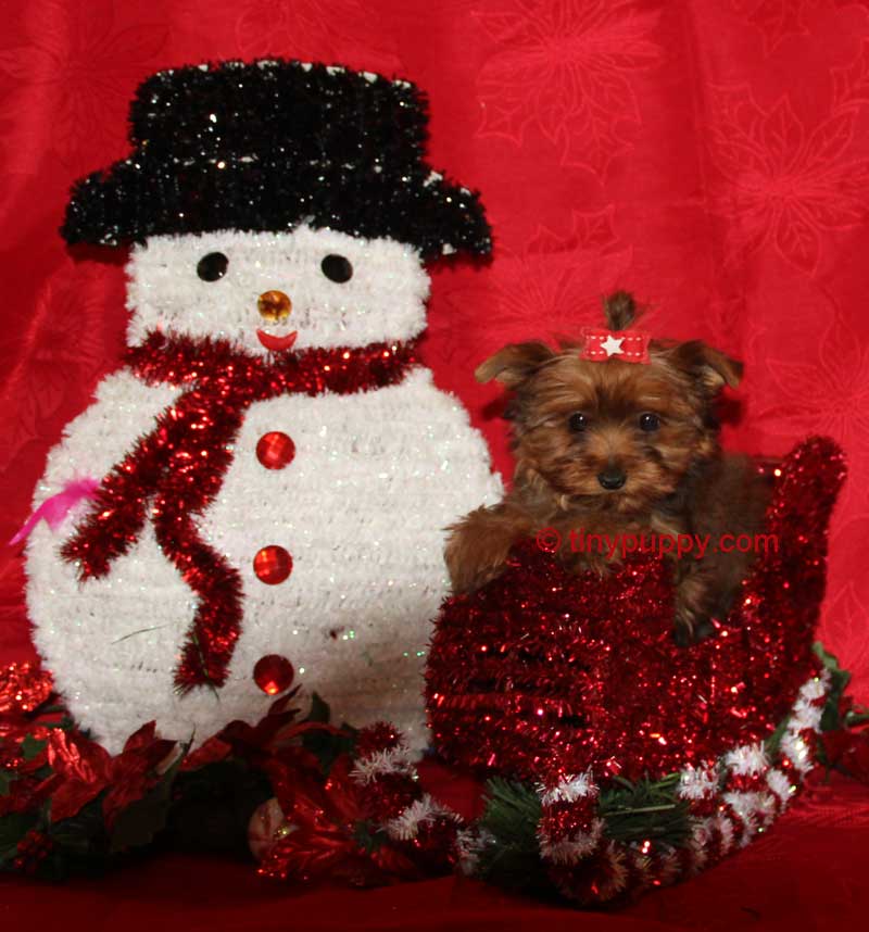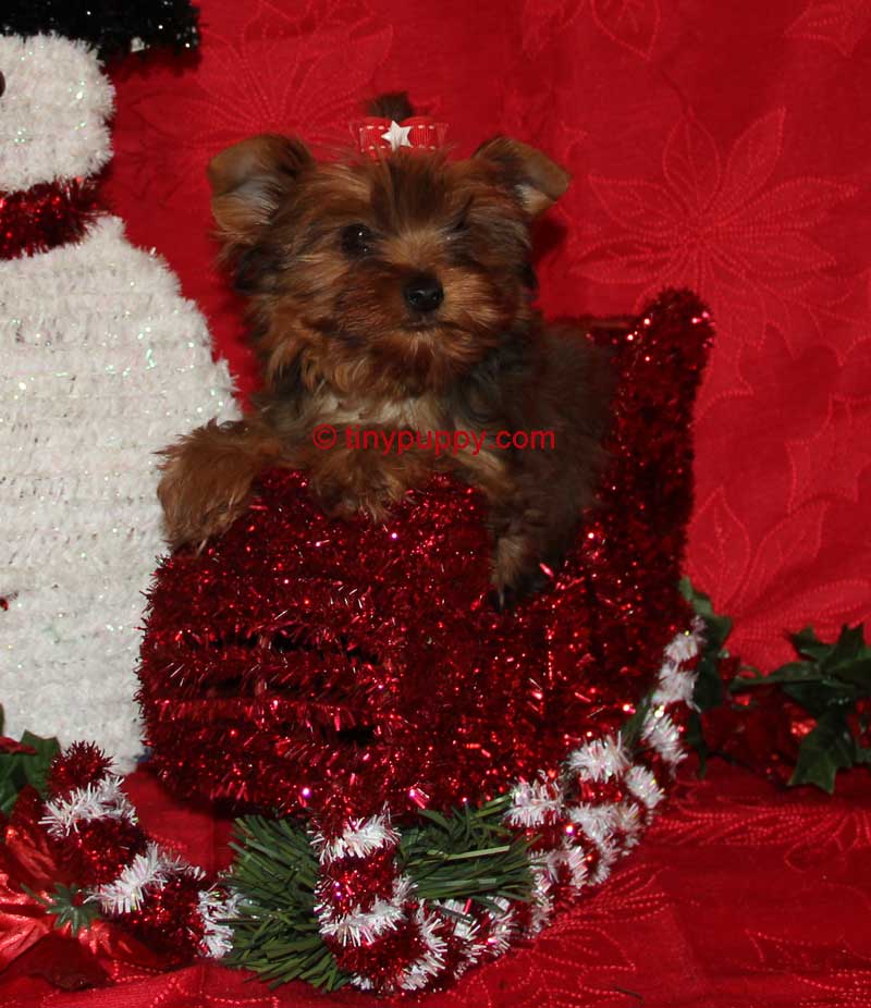 This is our truly sweet Teacup Yorkie, Charlie Brown. He joyfully bobbles along just like Charlie does with the Peanuts gang as they learn the true meaning of Christmas. Just like Charlie Brown this little sweetheart will win the hearts of everyone in your family. He is only 2 lbs and is 13 weeks old. What a doll. Charlie is 1/2 Parti Yorkie and 1/2 Golden Sable. He also has Chocolate Yorkie in his bloodline.