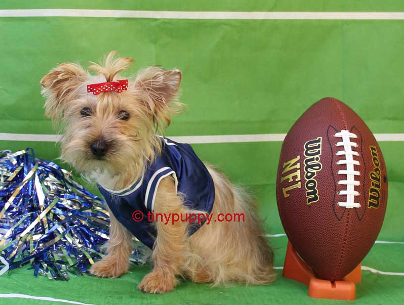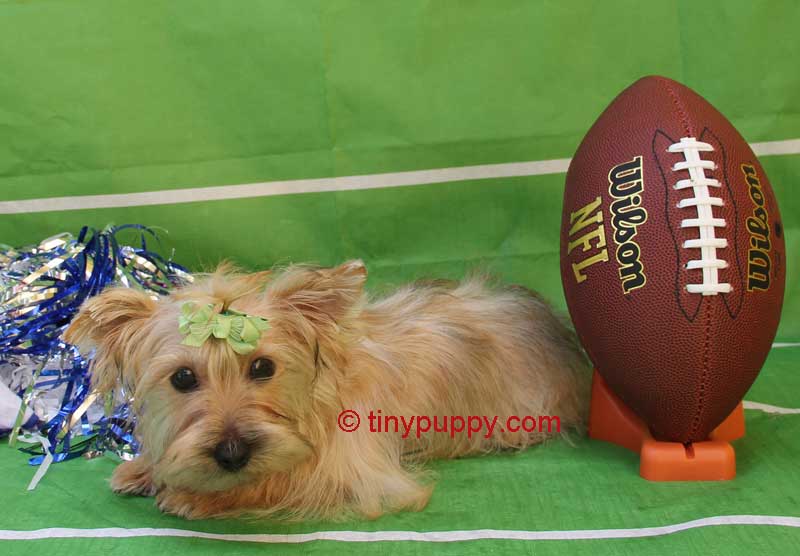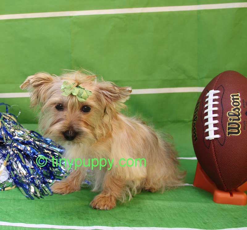 Our Little Jeremiah is geared up for the football season. He is 5 months old and 5.8 lbs. What a little sweetheart. He has that sweet personality that everyone loves. Jeremiah is ready now to come and watch those football games this year with you. Just a precious little lap dog. He is Blond and looks like his Mother. She has the Gold Gene. She is 6 lbs and 1/2 Parti Yorkie and 1/2 Black and Tan. Snickers is just 4 lbs and he is a Golden Sable with Chocolate lines. Just Beautiful.