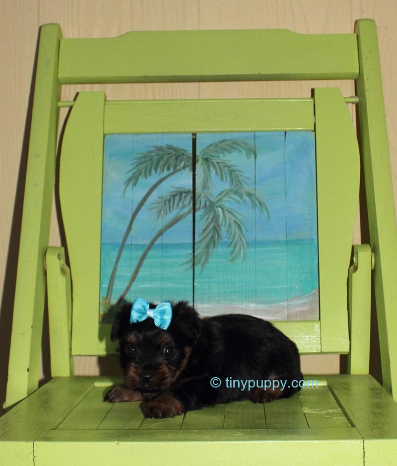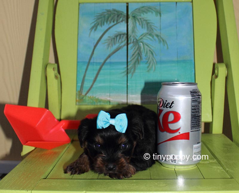 This absolutely adorable Teacup Yorkie is Captain. Captain weighs 23 oz at 5 weeks of age. His beautiful short and stalky body makes him look like a little teddy bear. His coat is thick and dark. Captain is 2.4 lbs at 14 weeks old. Captain, nick named Cappy is a little lover. He loves to cuddle and is a little lap dog. Cappy will be microchipped for his safety. His Mom is Nautica has many champions in her 5 generation pedigree. She has always had black and Tan puppies. His dad Snickers has the Black and Tan gene also and he is a dark chocolate.