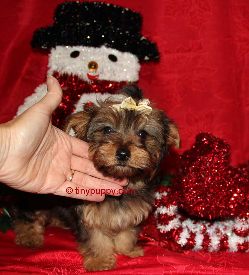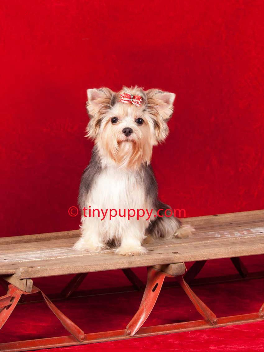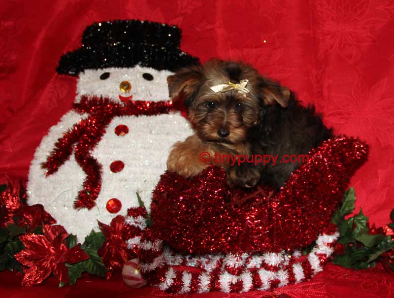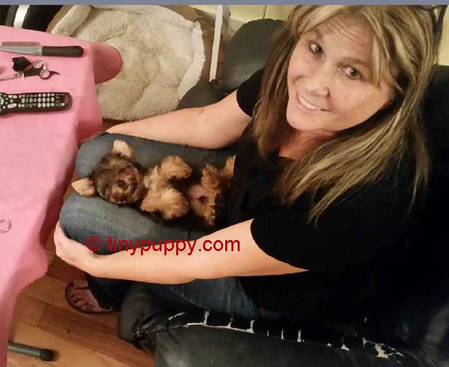 Little Yorkie Chester is the sweetest little lap puppy. He is the perfect little puppy to sit with you around keeping you warm by the fire. Chester is 2.6 lbs and is 13 wks old. His Mother has the gold gene and is a Parti Yorkie. Dad is a Golden Sable Yorkie with Chocolate and Black and Tan bloodlines. Chester is so easy going. I usually only post our glamour shots, but Chester is so laid back. I just had to add a picture of him just chilling, as I groomed him. His ears are almost up and when they go up he will be gorgeous. He already is.