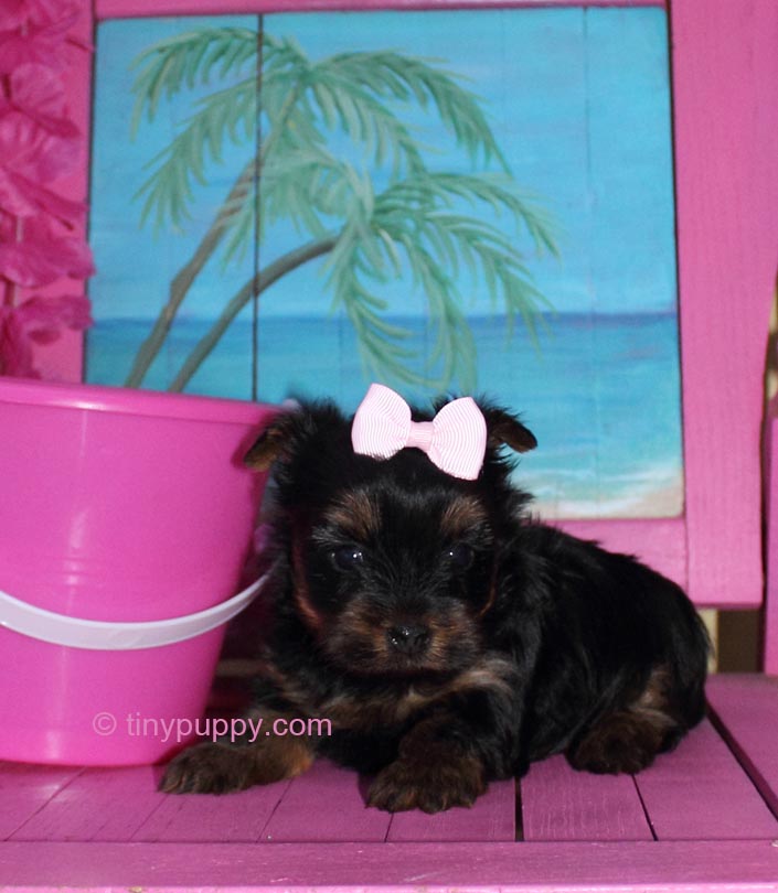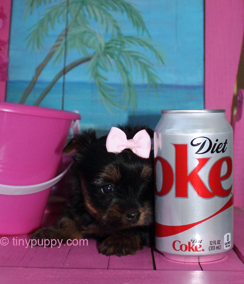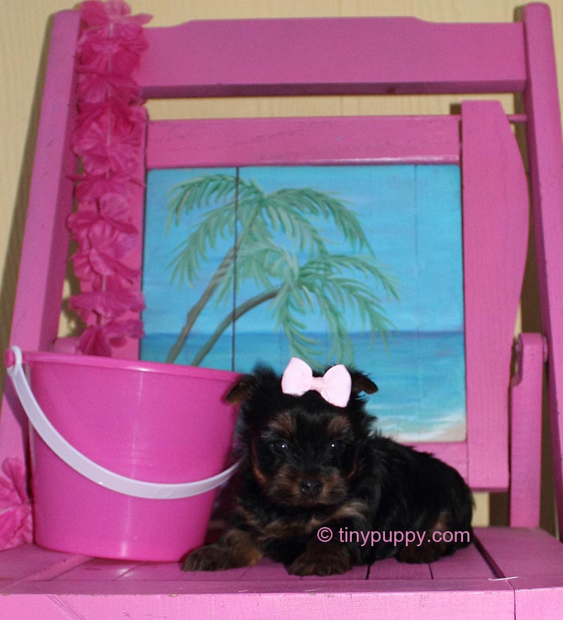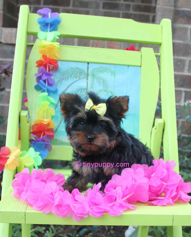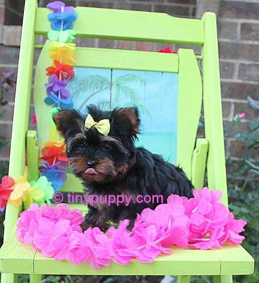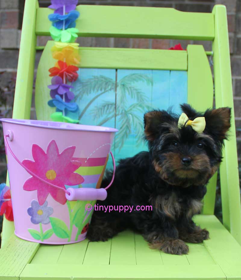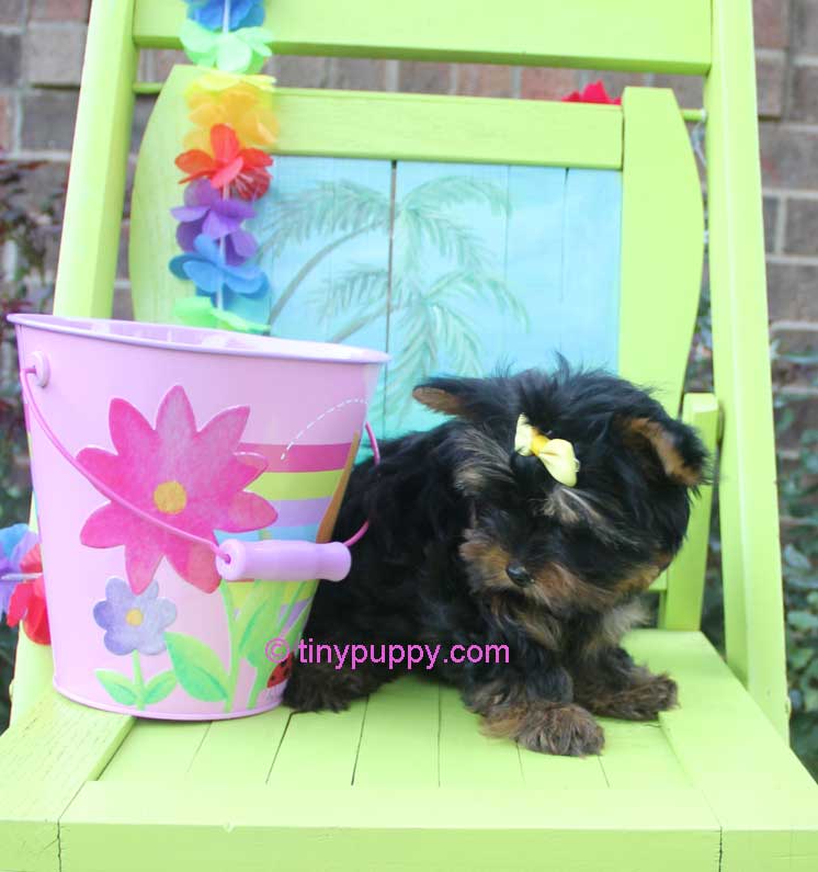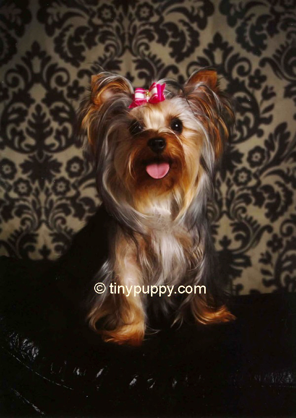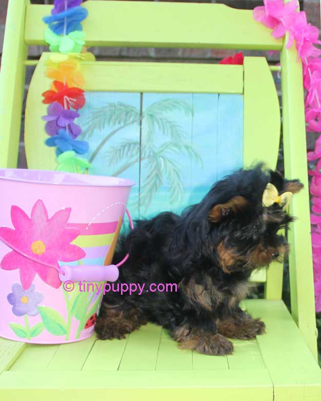 Our little Chloé is a sweet as can be. She has a wonderful Black and Tan thick coat and is just picture perfect. Even the coat on her legs is thick and beautiful. Chloé loves to play with her Brother Captain. This little girl weighs only 2.2 lbs at 12 weeks of age. Daddy is a Chocolate or Golden Sable Yorkie Puppy. Her Mom Nautica has always given us beautiful dark Black and Tan puppies. Nautica has many champions in her 5 generation pedigree including the Pastorial Bloodlines. She is Gorgeous!