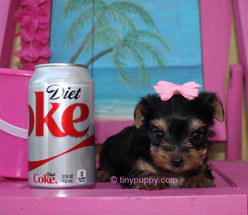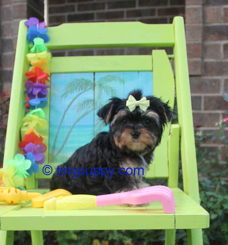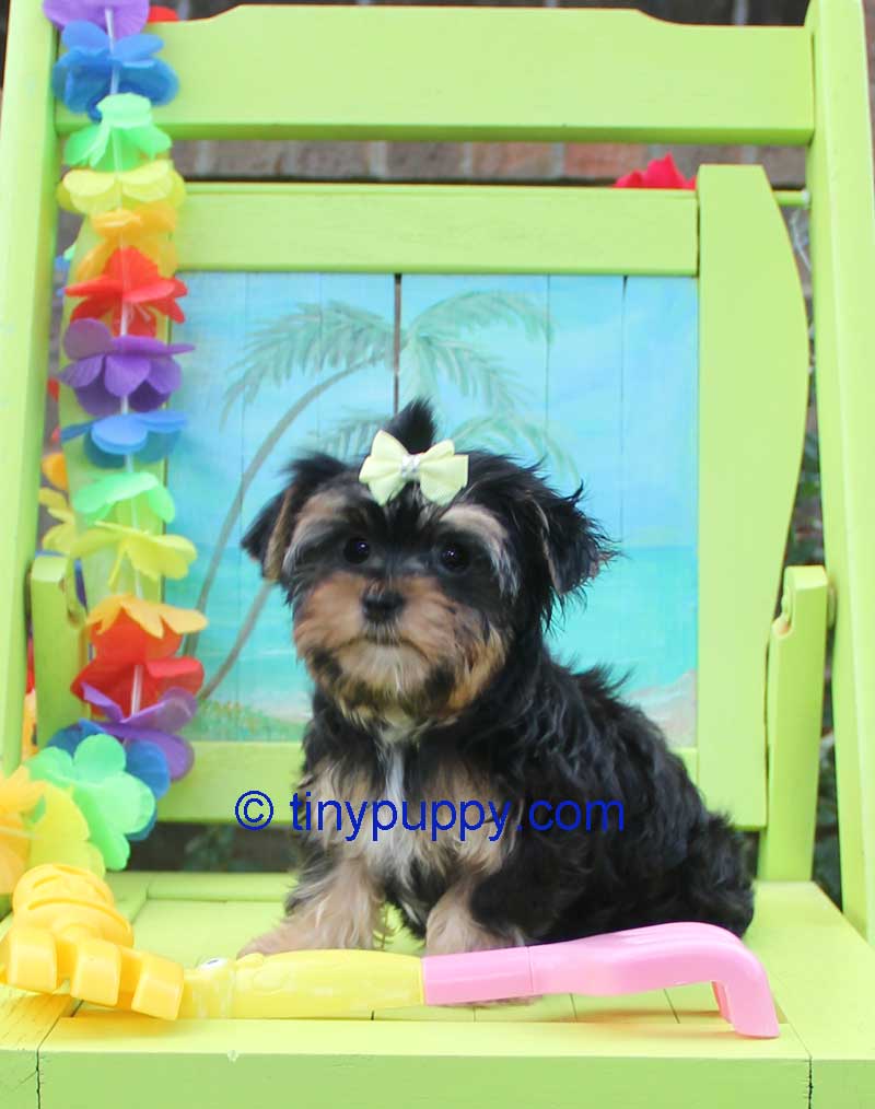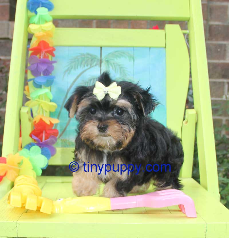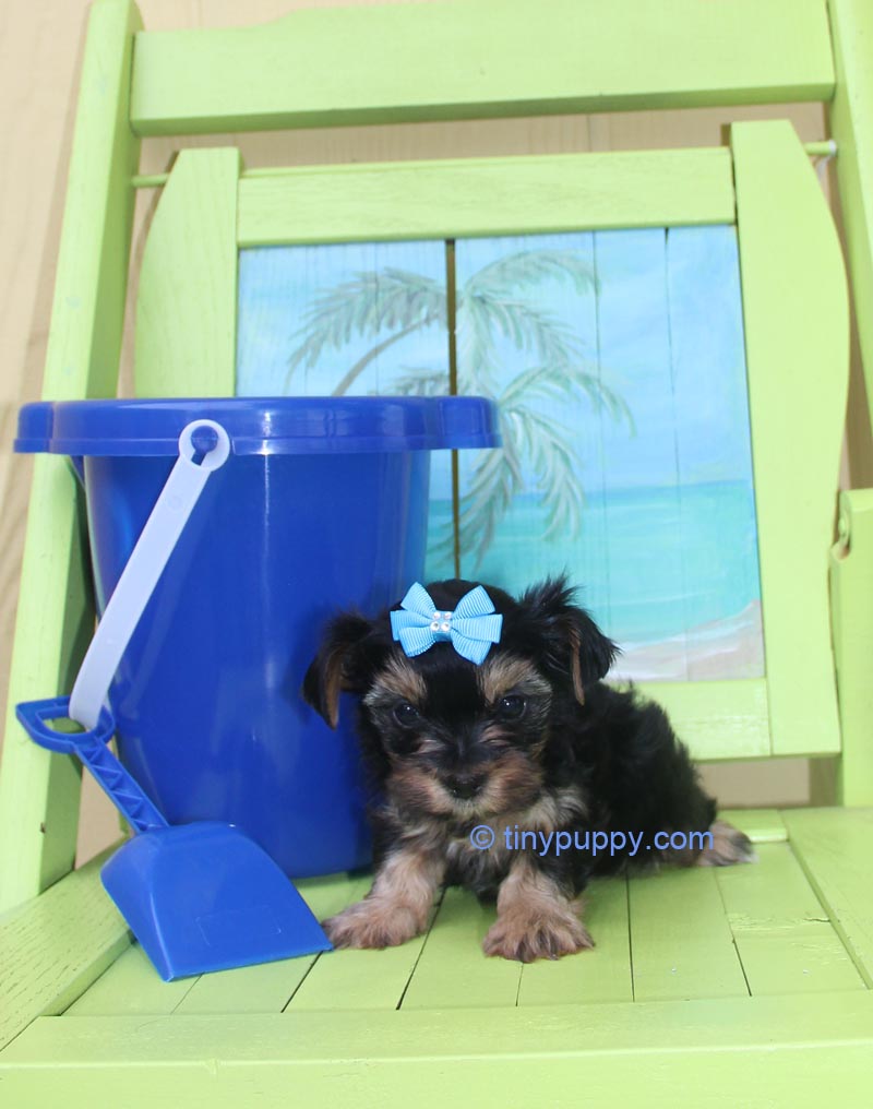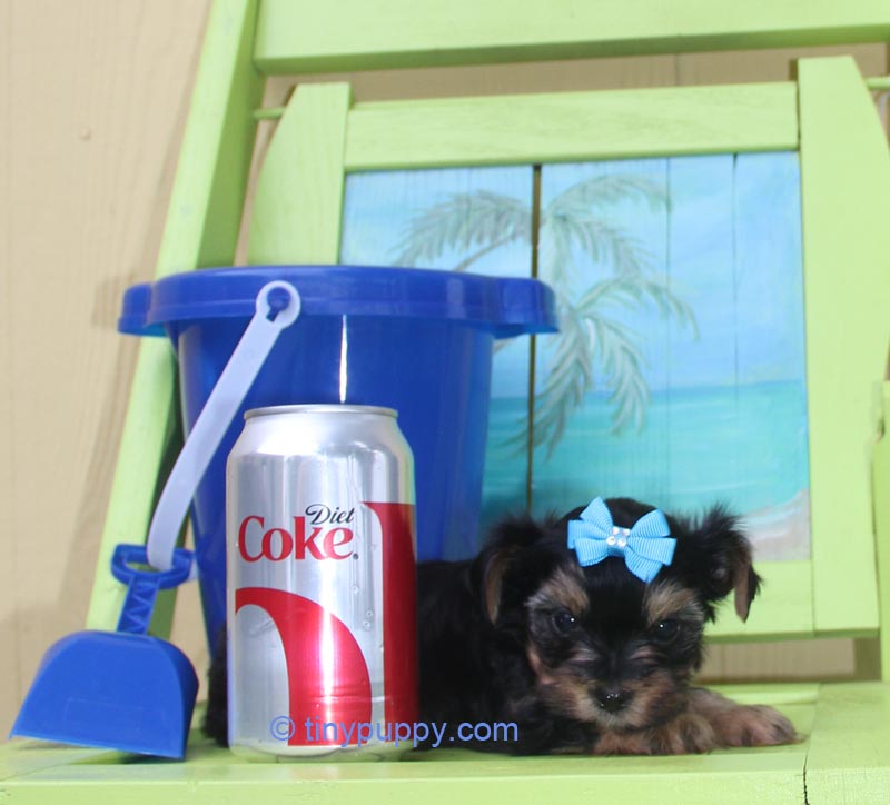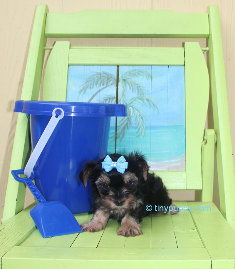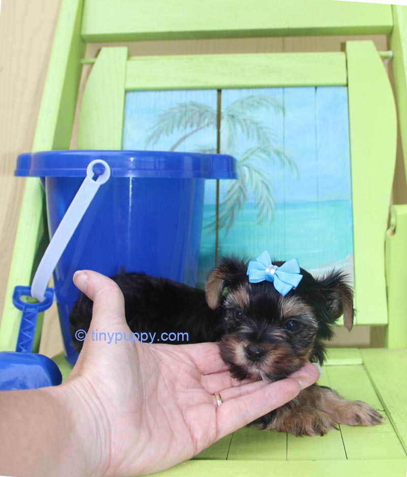 This Teacup Yorkie Boy is Mikimotto. Miki weighs only 24 oz at 12 weeks of age. He has a very sweet personality and loves to play with his sister. He has the tiniest little cobby body. Short and Stout but tiny tiny. Miki’s Mom is a Parti Yorkie with Champion Lines. His Dad is a Golden Sable Yorkie. Mikimotto has a nice thick coat and a wonderful little companion that you can take everywhere.