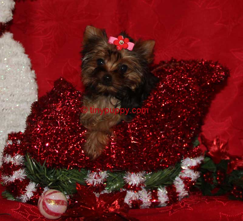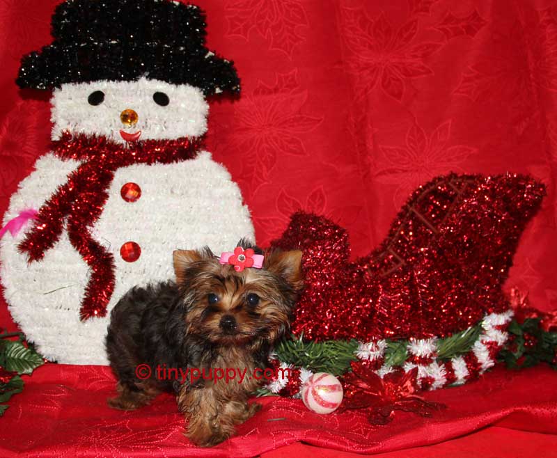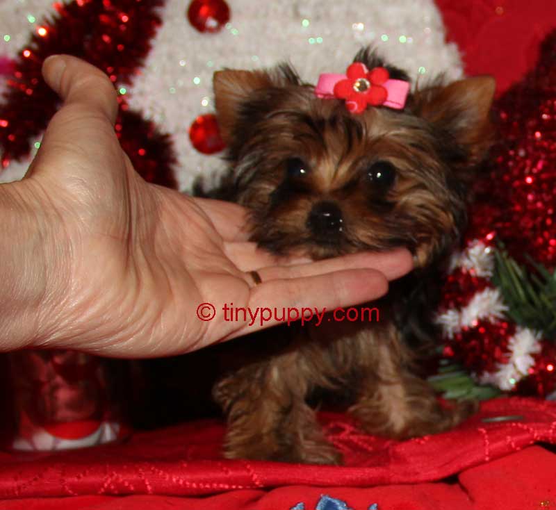 Micro Cocoa Mia is every Yorkie owners dream. Teeny Tiny Cocoa Mia is just 19 oz and 14 weeks old. She is the perfect little baby that can travel in a pet purse anywhere with you. Snuggle up by the fire with roasted chestnuts and Cocoa Mia and let this little girl enjoy some belly rubs. Cocoa Mia will be ready soon to be in your arms forever.