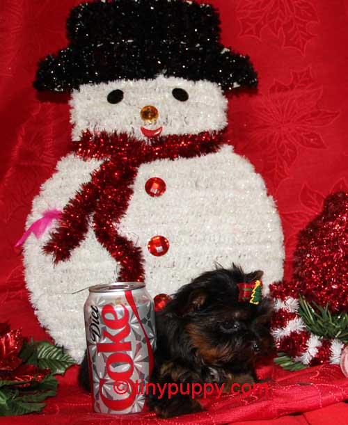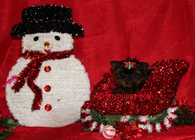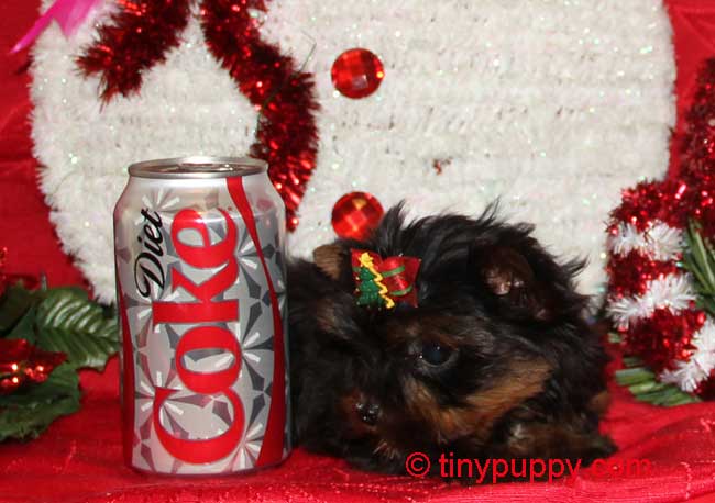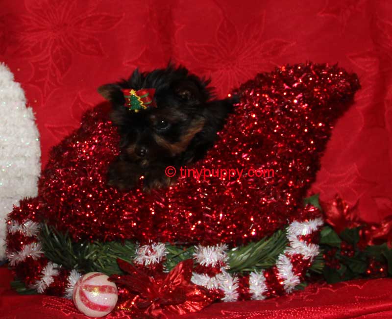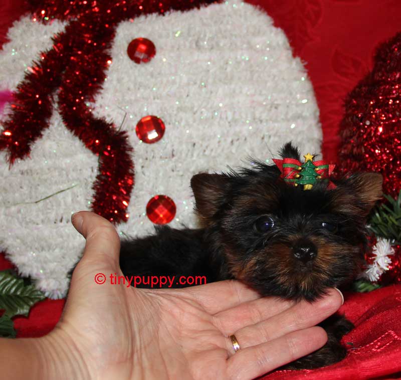 Our tiny Micro Yorkie Puppy Tiny Timmy is as cute as can be. At He has a sweet tiny face and a soft little coat and is ready soon to come keep you warm this Christmas. He has a dark, dark coat, short little ears and a tiny nose. This little guy is extra Tiny weighing 21 oz at 10 weeks. Taking Deposits now.