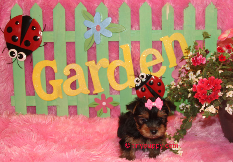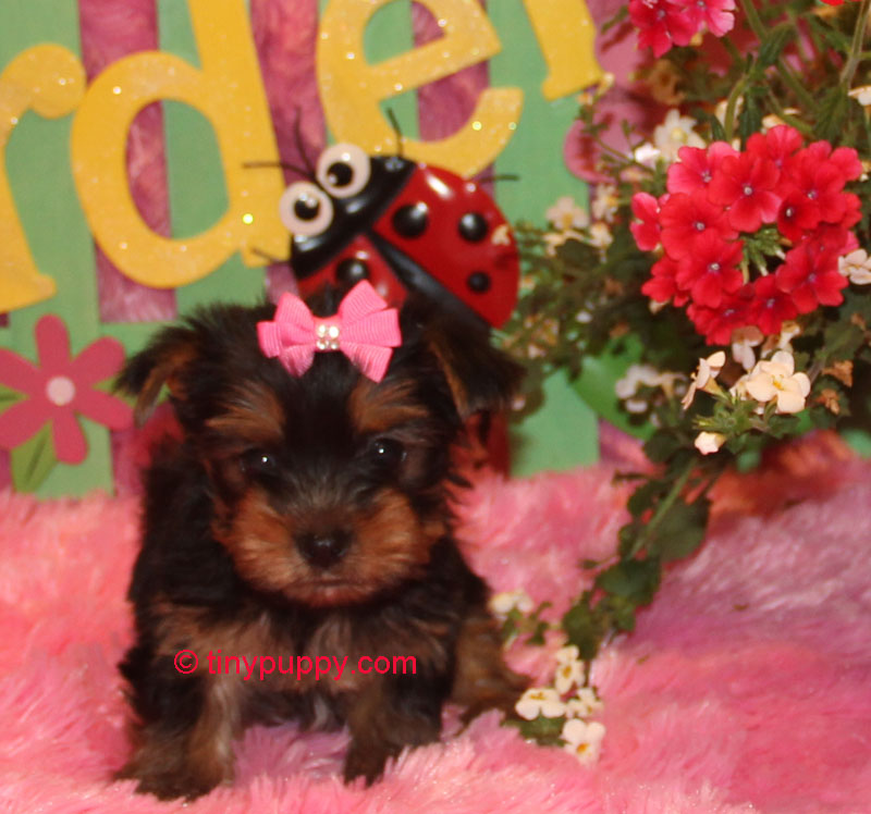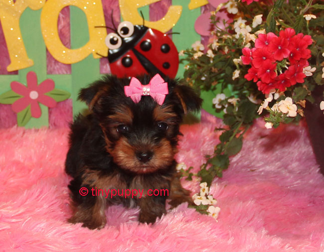 Teacup Yorkie Ariel comes from top notch bloodlines and is absolutely beautiful. She has a very soft plush coat that will be beautiful as an adult. She is sooo tiny at 22 oz and 7 weeks old. She is 1/4 parti Yorkie. Her Grandfather is a Parti Yorkie and comes from the Nikkos Championship Bloodlines.