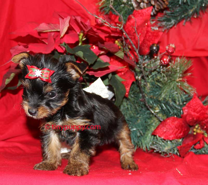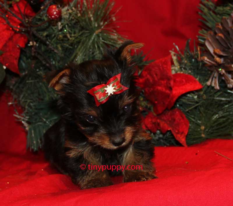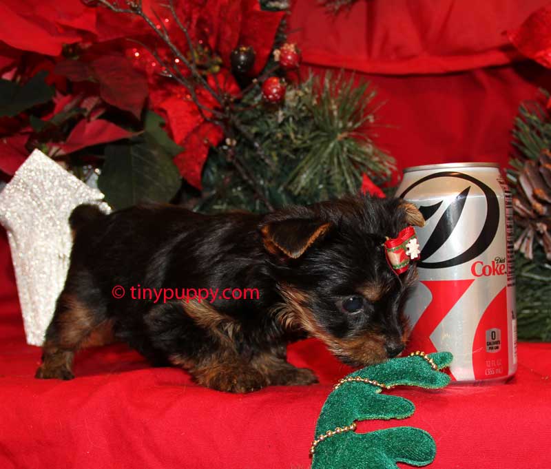 This tiny little Yorkie Boy is my little Chirstmas Spice. Tiny Spice is 17 oz at six weeks of age. This little guy has the best personality. He just turns and looks at you like. Come play with me. We’ll have fun. Although he is tiny now he will definantly be able to handle the Christmas hussle and bussle. Then he can just curl up on your lap and fill your heart with nothing but love. What a doll baby. He will be ready for Christmas. No doubt he will be getting everything he wants on his Christmas list because whoever gets this sweet little boy will spoil him to peices. Championship Bloodlines.