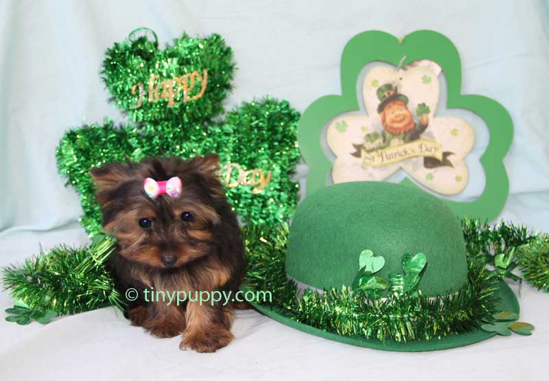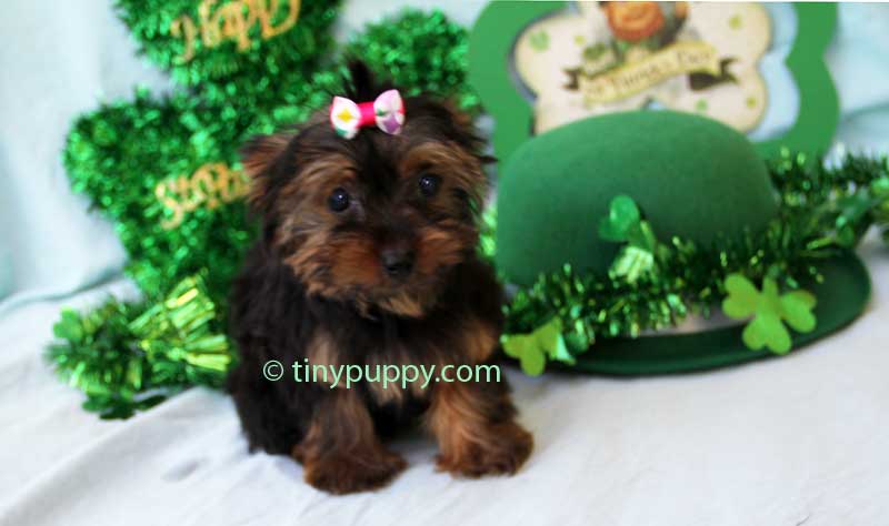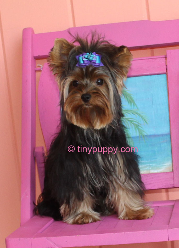 Sweet little Valentine Yorkie is sure to win your heart. Weighing only 35 oz at 15 weeks, she is extra tiny. Our little Maci teacup yorkie is a precious little gem and a real snuggler. She will steal the heart of everyone and look both ears are almost up.  She will be tiny and gorgeous.  Family loved and Family raised. This beautiful little girl has Championship bloodline on the mother’s and Dad’s downlines. She is ready now to come and be your tiny sweetheart.