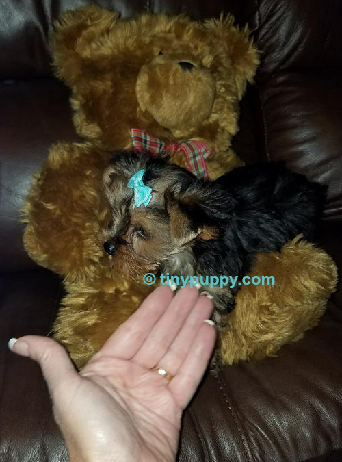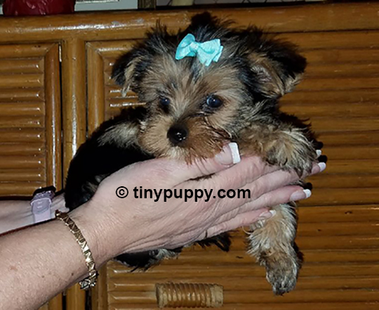 Tiny little Mickey is as cute as can be. He has a black and tan coat. Weighed only 1.8 lbs at 11 weeks of age. This little guy is very happy and already plays with toys. He loves everyone and is not a shy puppy. He would be a great little lap dog to because he loves to be held.