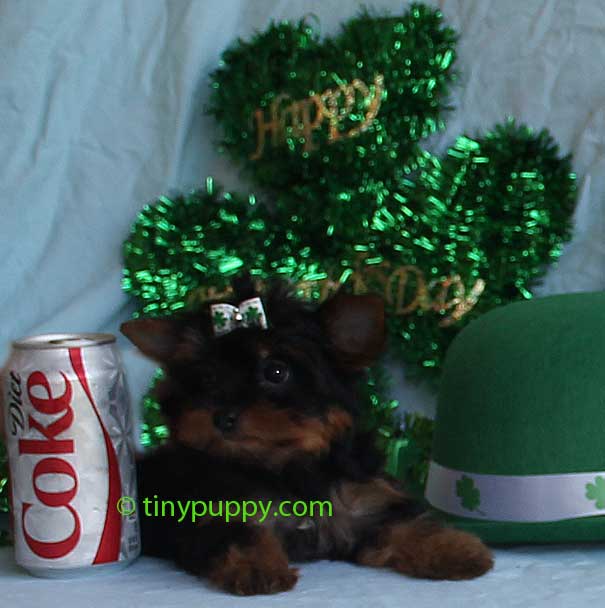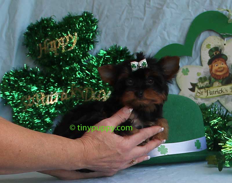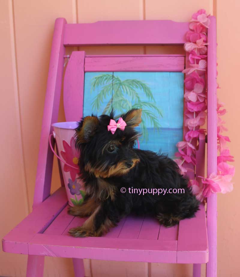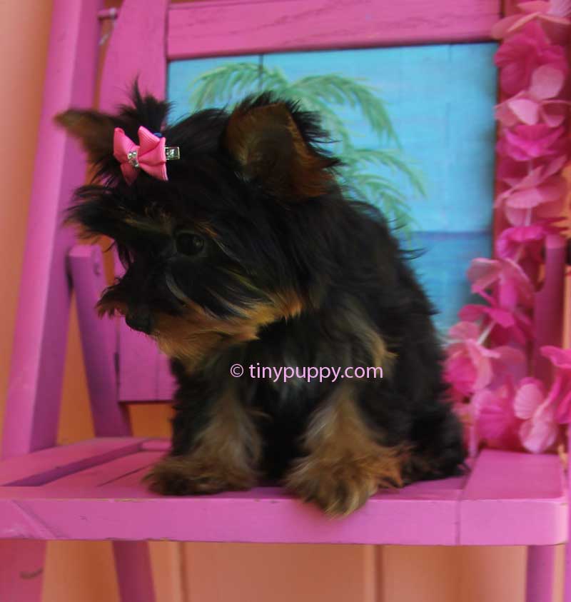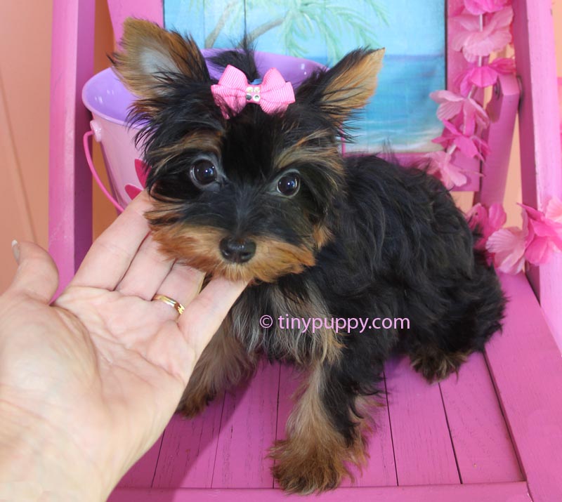 This little yorkshire terrier puppy is Demi. Oh my goodness she is such a doll. Demi is a pretty as can be. Her little smile lights up the entire room. She is only 2.6 lbs and 4 months old. She is a beautiful very dark Black and Tan. Her mother has several champions in her bloodline from the Pastoral lines. Her Dad is a Golden Sable color with Chocolate Bloodlines. She is ready now to be your little sweetie pie.