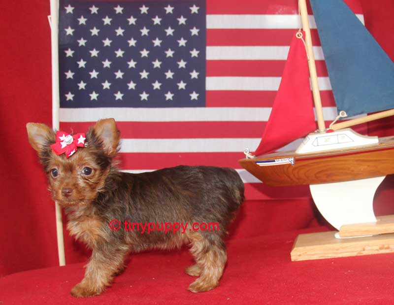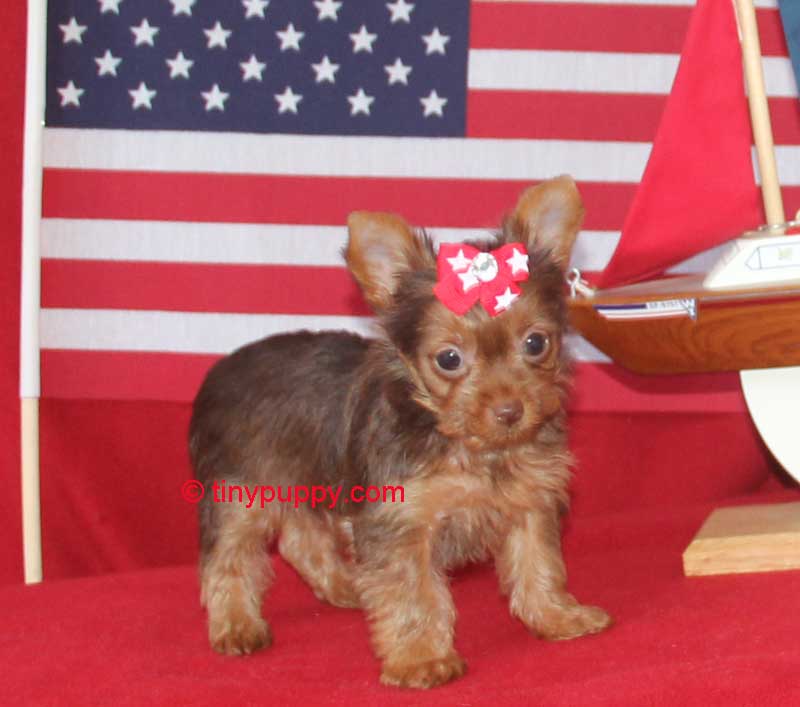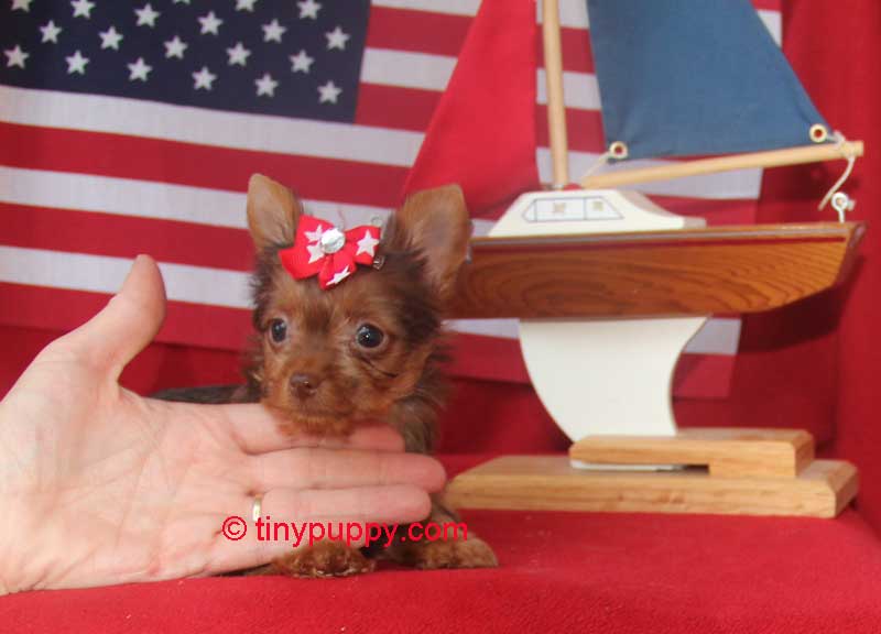 Tiny tiny Red Yorkie Ginger is a cute as can be. She weighs a mear 2 lbs at almost 16 weeks of age. Her mom is a Chocolate Yorkie and her Dad is a Liver and Tan Yorkie. She is so tiny and just as cute as can be. She loves to play with her sisters. She is very socialble but loves to cuddle. We fly with our puppies to deliver them. Ginger is estimated to be 3lb s full grown. Oringinally we estimated 3.5 to 4 but this little girl just never grew. Tiny and petite she is. She will be that perfect little pet purse baby.