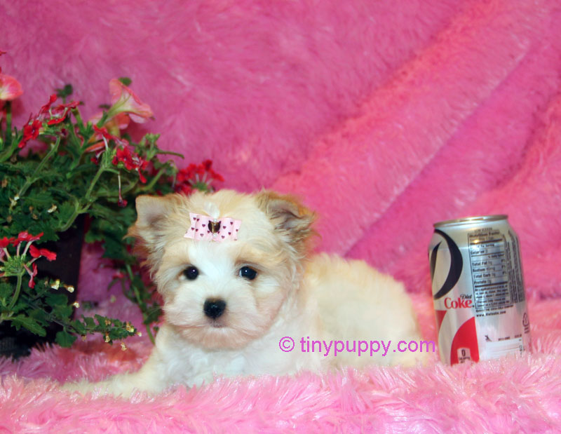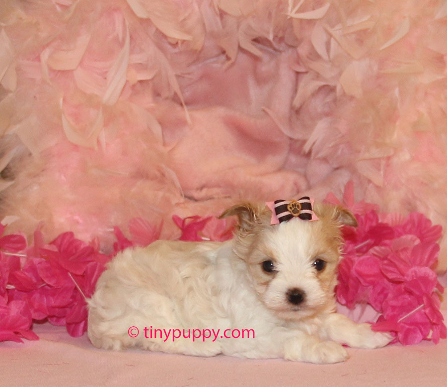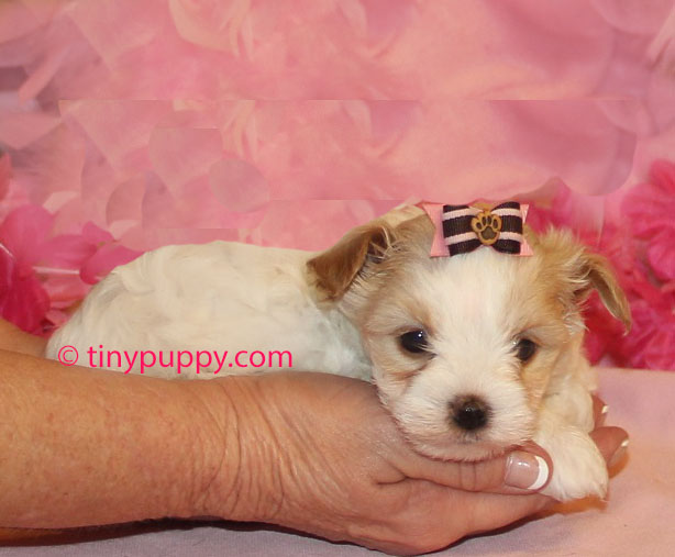 This is Buttercup.  She is a rare Gold Dust Parti Yorkie.  She is such a tiny little girl and as pretty as can be.  She is just 2.2 lbs at 12 weeks of age.  She and her sister Goldilocks are weaning from their Mama now.  Buttercup has beautiful markings.