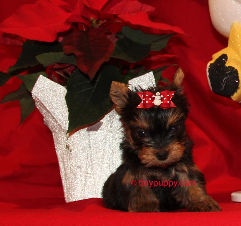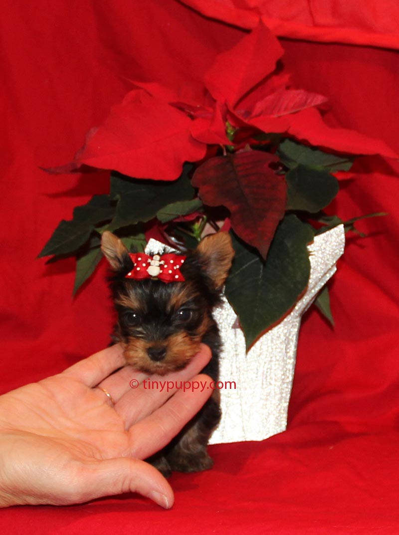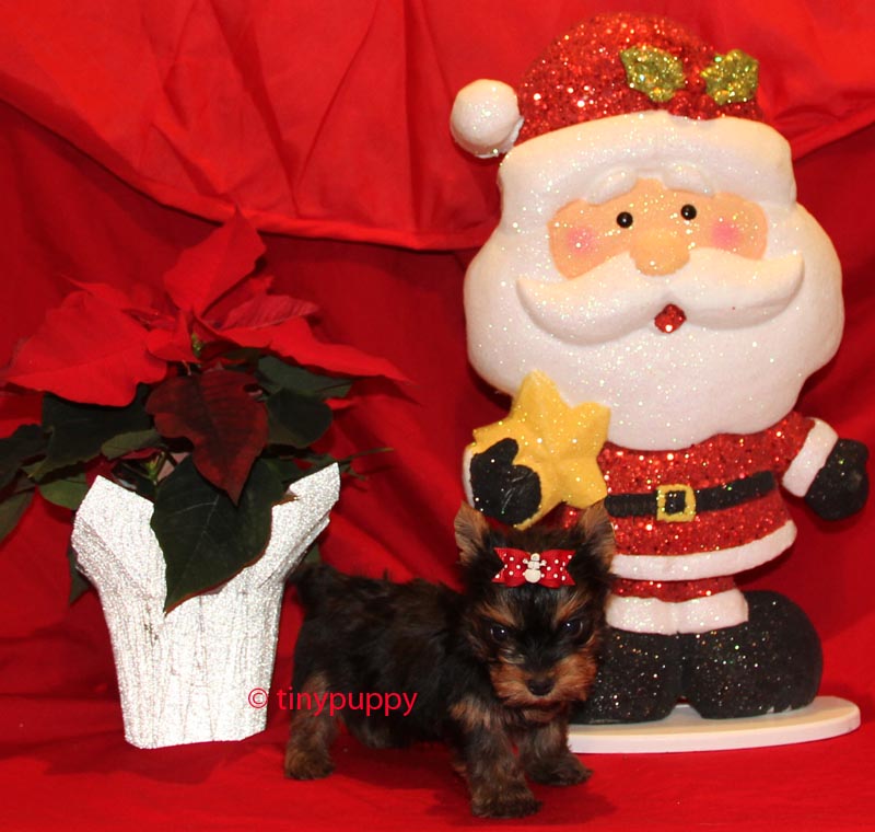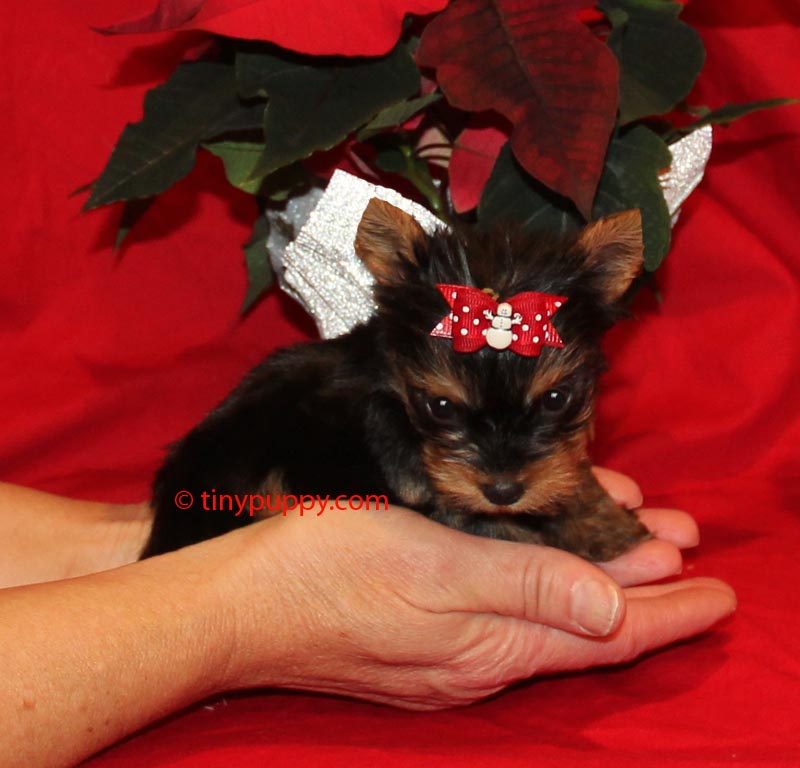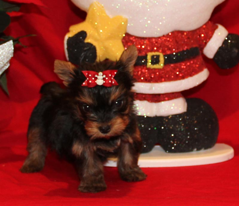 Our X-tra tiny Micro Yorkshire Terrier Christmas Jingle is a mellow little guy. He is just going to be the best little lap dog a person could want. Snuggle up by the fire with roasted chestnuts and cocoa and just let this little guy snuggle on your lap. He is only 13 oz at 6 weeks of age and his pedigree has Championship Bloodlines. This petite little guy is estimated to be in the 2.5 lb range. Give your Sweetheart this little Yorkie for Christmas!